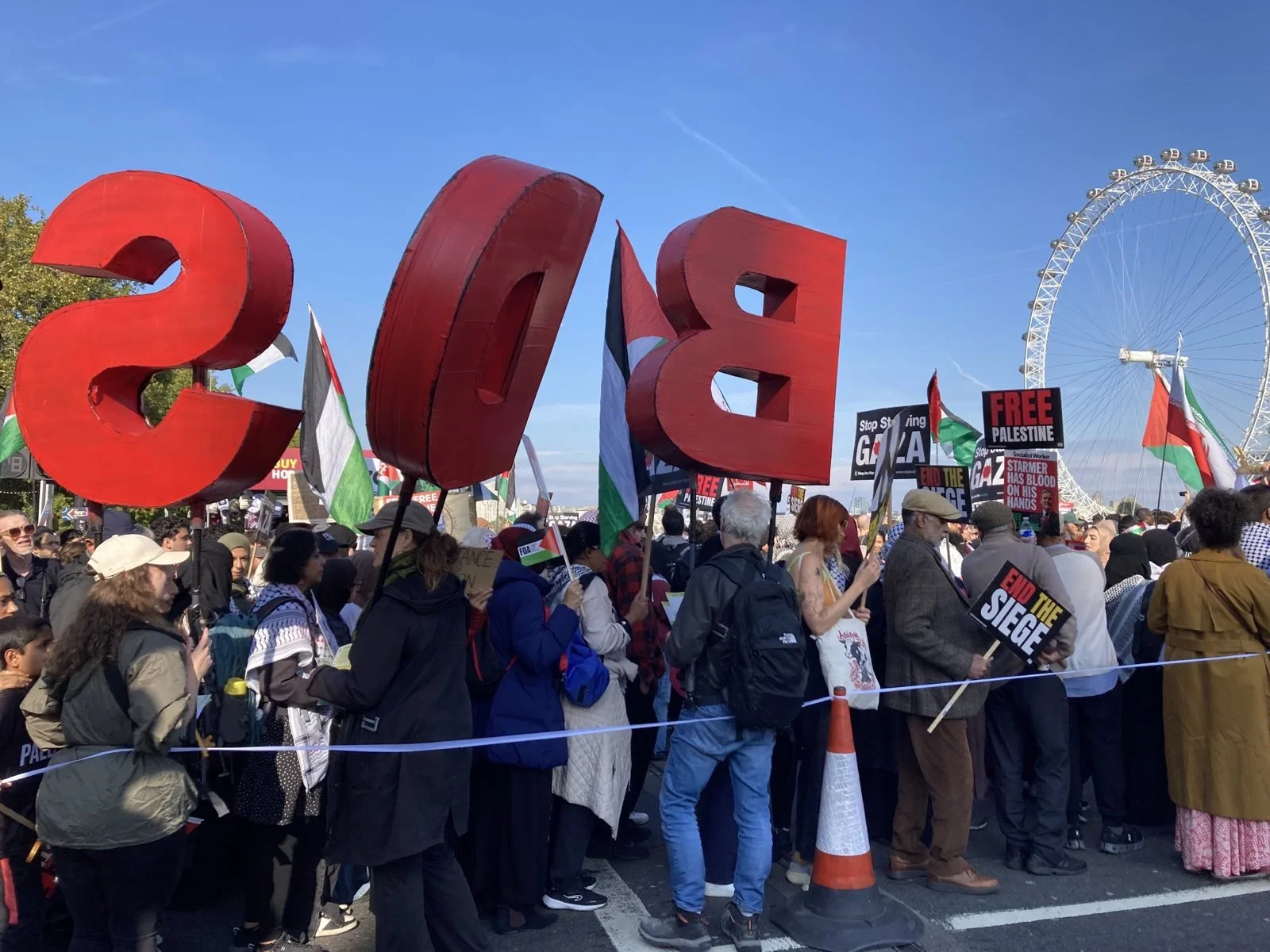 Photo of protesters on a bridge against a clear blue sky with parts of the London eye visible in the background. People are wearing keffiyehs and carrying Palestinian flags, signs that read ‘end the siege’ and the giant red letters ‘BDS’.