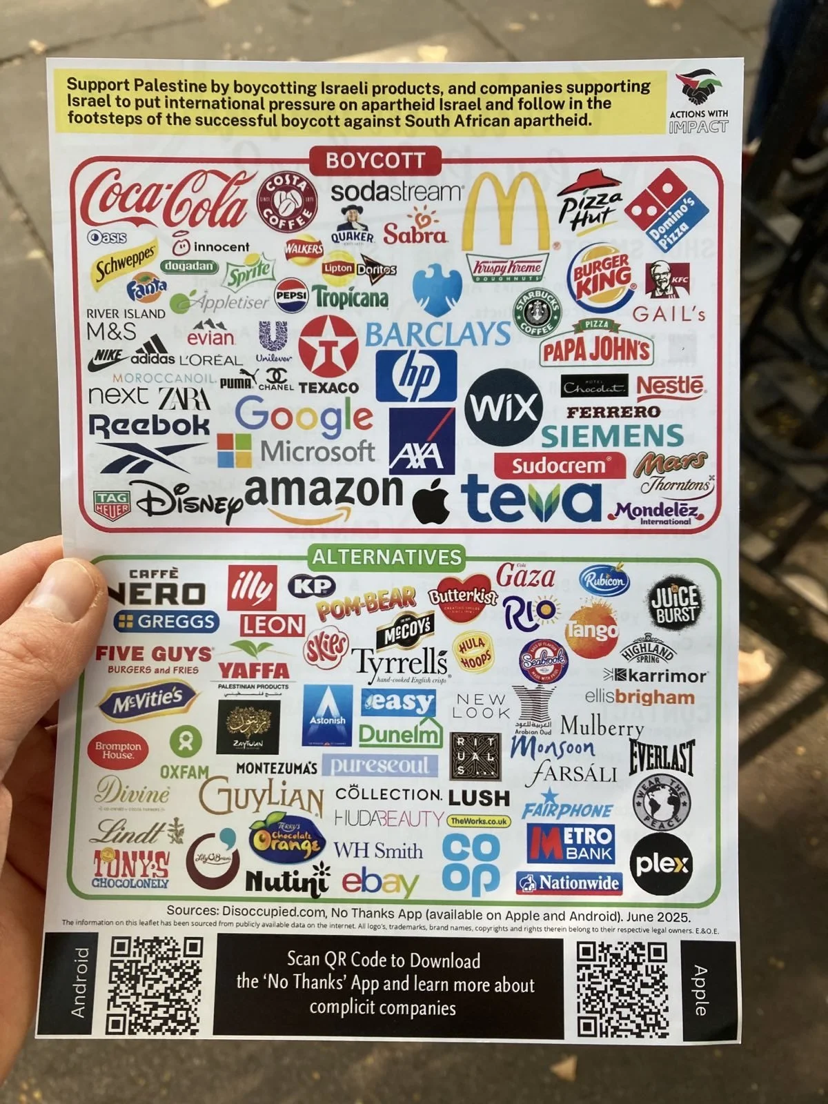 Photo of a flyer by Actions with Impact in two sections listing brands to boycott and brands to use as alternatives